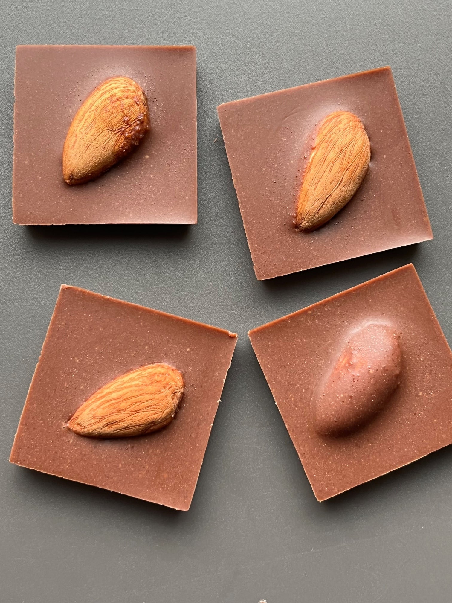 アーモンドチョコレートのハーフサイズは、ミルクチョコレートのハーフサイズの裏面にアーモンド一粒を丸々トッピングしたお得な商品です。「ミルクチョコレートばかり60枚はちょっと・・」という方にオススメしたいと思います。